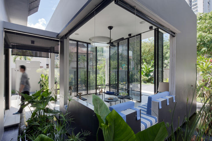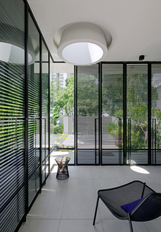 The client likes the original semi-detached house and wanted to renovate it to suit his lifestyle. He likes to entertain small to medium groups of friends, as he likes to cook and bake. As such, the entire first storey was designed so that guests can gather at different distinct spaces depending on the activity they were engaging in. The lush gardens at the first storey flow seamlessly into the interiors via operable full height glass doors. The second storey contain private resting and work spaces. The interior design was done by Scope ID.